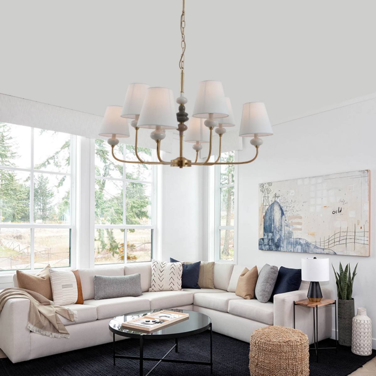 في هذه الثريا النحاسية الخزفية الكلاسيكية ذات 8 أضواء، تم تزيين السيراميك في الجزء السفلي من غطاء المصباح ليكون بمثابة دعم وتزيين. كما تم تجهيز العمود المركزي للمصباح بثلاثة خزف مختلفة الأحجام والألوان. يؤدي هذا إلى إثراء الجزء المركزي من الثريا النحاسية الخزفية الكلاسيكية ذات 8 أضواء ويتجنب أن تكون بسيطة ورتيبة بشكل مفرط. ولهذا السبب فهي تحقق مبيعات جيدة جدًا.